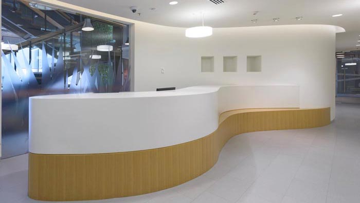前臺的設(shè)計:進(jìn)入空間之后首先看到的就是流線型的設(shè)計,這是設(shè)計師根據(jù)空間的特性所設(shè)定的,同時前臺的設(shè)計也有指引的寓意在其中,波浪形的外型清楚的向人指引著前進(jìn)方向,波浪總是一浪還比一浪高,寓意著企業(yè)如竹子花開一樣節(jié)節(jié)攀升。