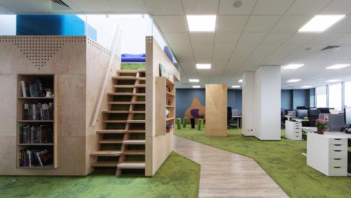 動(dòng)線的設(shè)計(jì):當(dāng)我們沿著動(dòng)線進(jìn)入到內(nèi)部空間的時(shí)候,綠色的地毯給空間帶來了絲絲生機(jī),地板走廊好似森林中延伸的彎曲的小路,指引著我們走進(jìn)空間的深處,同時(shí)也為辦公空間帶來了一絲神秘感,讓我們對(duì)空間充滿了好奇,這樣的設(shè)計(jì)為我們勾勒出一處童話的世界。