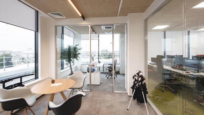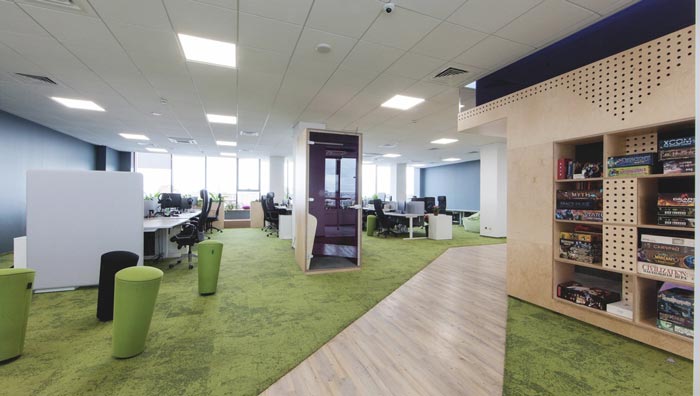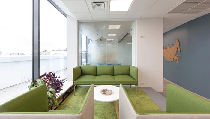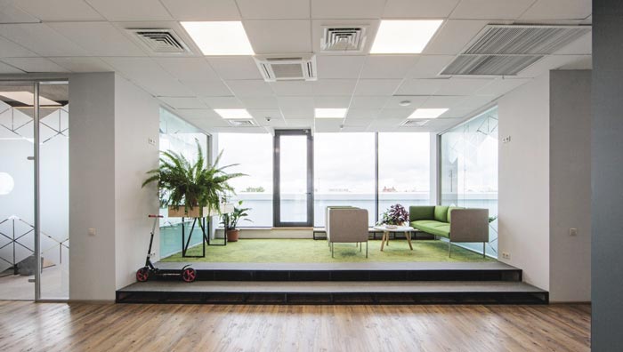 辦公區(qū)域的設(shè)計(jì):在設(shè)計(jì)師看來辦公有時(shí)候就是在重復(fù)同一件事,這樣就很容易讓人有浮躁之心,在這樣的情況下,去除浮躁之心就是重中之重,這也是設(shè)計(jì)師采用綠色地毯的目的,設(shè)計(jì)師希望為空間營(yíng)造一種童話的氛圍,讓員工在其中可以靜下心來認(rèn)真的思考,理清自己的思路,如此浮躁之心自會(huì)消失。
