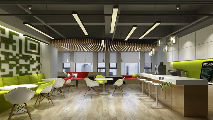 網(wǎng)絡(luò)辦公室茶水間設(shè)計:空間很大一部分被用來作休息之用,設(shè)計師希望員工可以在這里遠(yuǎn)離喧鬧的工作、與快速發(fā)展的社會進(jìn)程,在此地回歸自己、找回自己,為下一步的進(jìn)步積蓄能量。