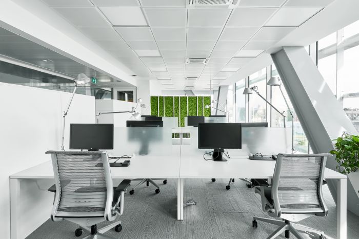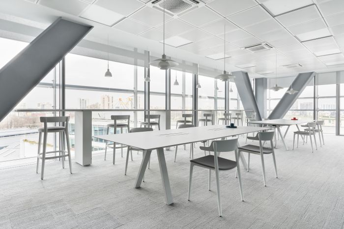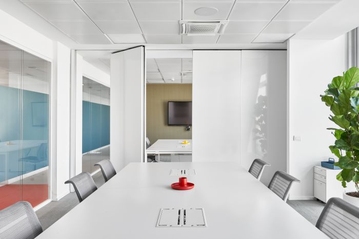 設(shè)計師在新的辦公室中劃分了包括用于非正式會議的工 作區(qū)、配備視頻會議的會議室。獨立會議室、項目室、圖書館和專門用于一對一會議和重點活動的空間。