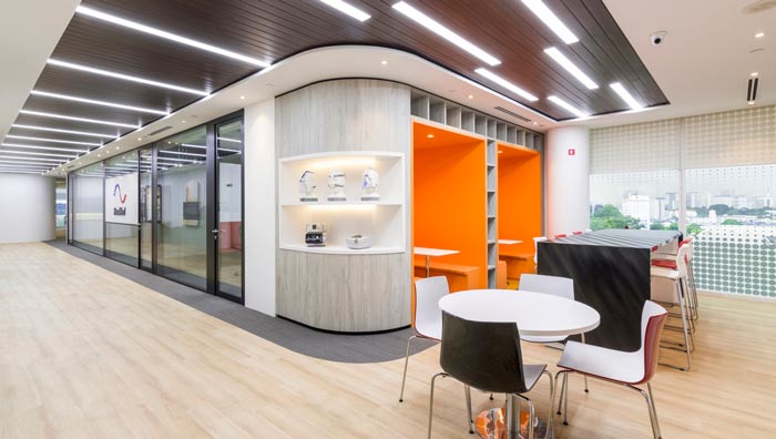 封閉、開(kāi)放交流空間的設(shè)計(jì):此處是一個(gè)有趣的組合,開(kāi)放的交流空間與封閉的交流空間,完美的融合在一個(gè)空間之中,這樣設(shè)計(jì)也是設(shè)計(jì)師突發(fā)奇想,在設(shè)計(jì)師看來(lái)每一個(gè)對(duì)于交流空間的要求都不同,為了滿足大部分人的需求,故此開(kāi)放與封閉融合也就勢(shì)在必行。