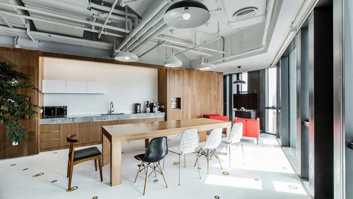 茶水間的設(shè)計(jì):設(shè)計(jì)師在設(shè)計(jì)的時(shí)候,將其安置在空間的一個(gè)角落區(qū)域,此處呈三角形分布,設(shè)計(jì)師在設(shè)計(jì)中將茶水柜安置在空間三角的一條直線上靠墻分布,這樣的好處就是可以為空間留下足夠的使用空間,其中分布有休息桌椅、電視柜、沙發(fā)等,這樣可以讓員工在此地得以放松與歸零。