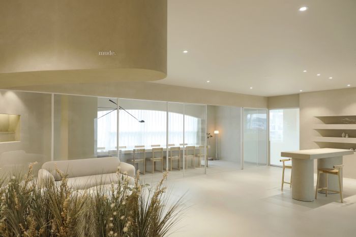 這是一個化妝品品牌的公司辦公室,有500方的面積。設(shè)計師希望這個辦公室成為表達品牌的調(diào)性和品牌核心價值的空間。設(shè)計師創(chuàng)造了一個優(yōu)雅的空間,整體設(shè)計使用曲線表達了品牌形象。