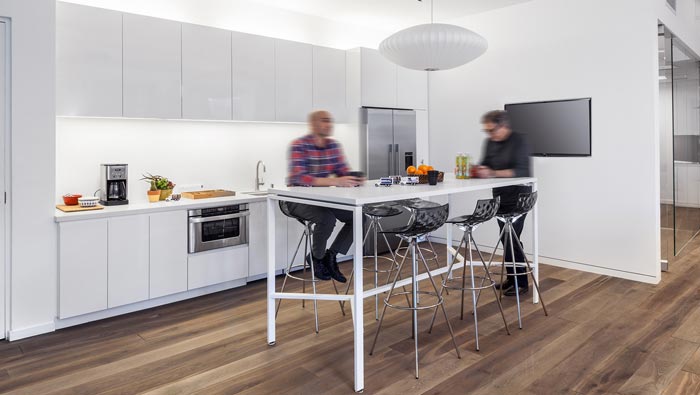 茶水間的設(shè)計:設(shè)計師在設(shè)計的時候,利用空間結(jié)構(gòu)的優(yōu)勢,將茶水間通過成組式茶水臺、茶水柜進行包裝,同時在色彩上采用白色做為主色,因為白色自身有向外擴張的特性,設(shè)計師希望通過此種屬性在一定程度上影響空間的視覺感受,讓空間在視覺上加以延伸。