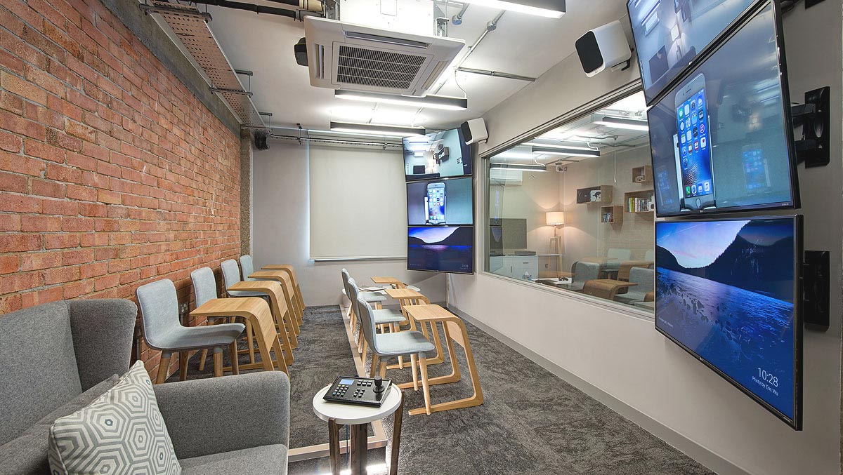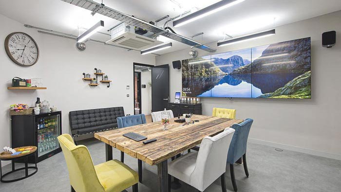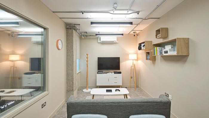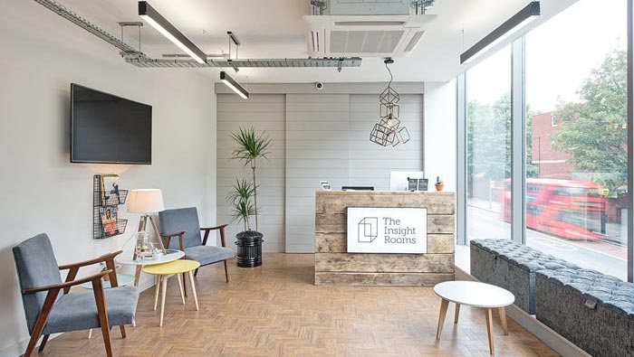 進(jìn)門區(qū)域的設(shè)計(jì):設(shè)計(jì)師在設(shè)計(jì)的時(shí)候,將前臺(tái)與接待區(qū)域融合在一起,這樣設(shè)計(jì)的好處就是可以將兩個(gè)空間濃縮在一起,以此減少空間的負(fù)擔(dān),為其他空間創(chuàng)造出更多的使用空間,客戶進(jìn)門后看到的就是the insight rooms(洞察室),這樣表現(xiàn)了企業(yè)的文化與追求,企業(yè)希望在不斷的探索與洞察當(dāng)中為未來做出一定的推測(cè)。