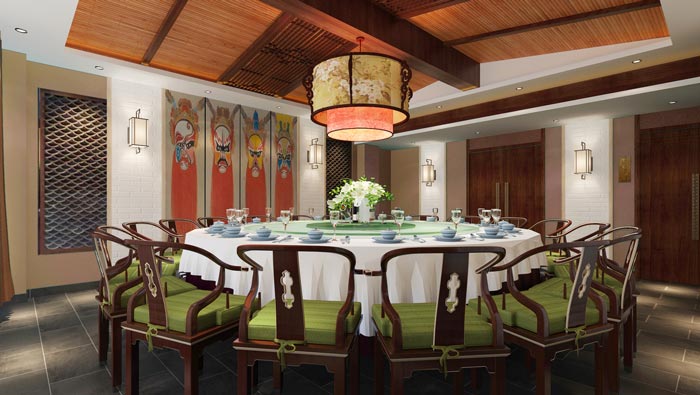 川菜館三樓包廂裝修設計:這里可以坐下16個人,這里適合公司之間、一大家子之間的聚餐,這里的氛圍是餐館的競爭優(yōu)勢所在,設計師希望這里菜肴絕佳、氛圍絕佳、服務絕佳。
