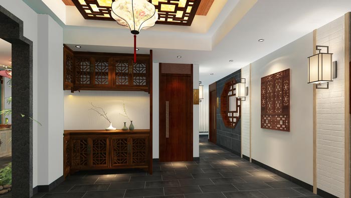 川菜館二樓玄關裝修設計:客戶經過樓梯進入玄關,經過玄關進入客房,一環(huán)套一環(huán),古色古風的設計在空間中延續(xù),目的就是空間有一種,自始至終的感覺,給客戶以安心。