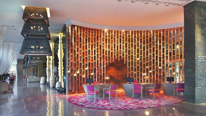 前臺(tái)的設(shè)計(jì):當(dāng)顧客進(jìn)入空間之后,首先感受到的就是當(dāng)?shù)氐娘L(fēng)土人情,這也是設(shè)計(jì)師希望看到的場(chǎng)景,在設(shè)計(jì)師看來(lái)設(shè)計(jì)是要因地制宜的,在設(shè)計(jì)中設(shè)計(jì)師在當(dāng)?shù)剡M(jìn)行了多次的調(diào)研,目的就是要尋求當(dāng)?shù)鼐哂写硇缘慕ㄖc文化,并將其縮小后融入空間之中。