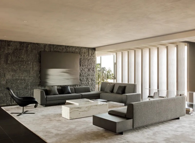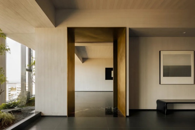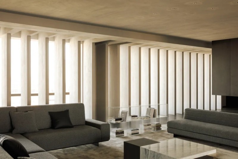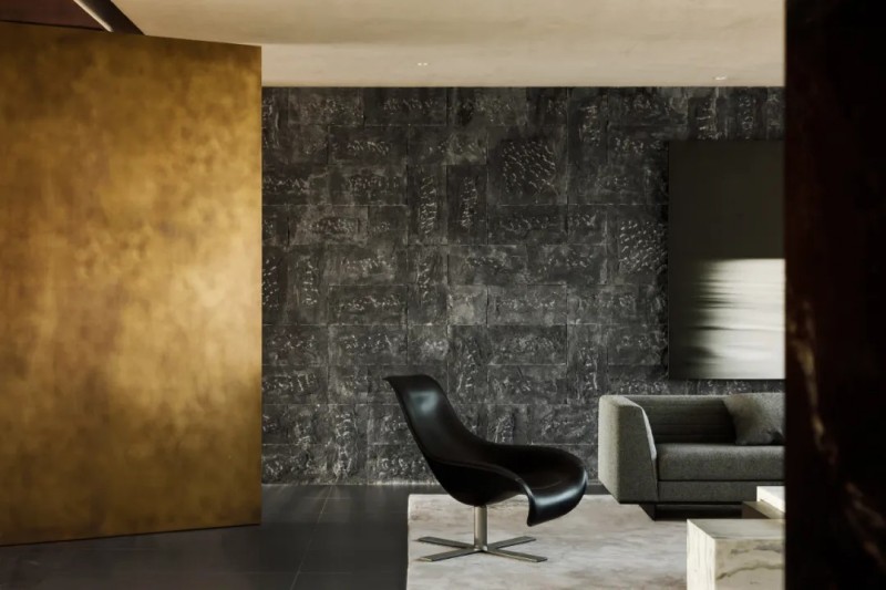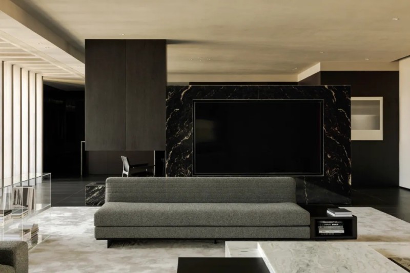 整體材質(zhì)幾乎是藝術(shù)微水泥,肌理與色彩給予更沉浸式的簡約素樸,對(duì)撞局部的仿銅與大理石,凸顯空間氛圍的厚實(shí)與精細(xì),也在簡約中增加豐富性。