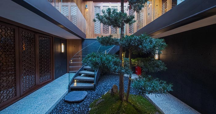 本次為民宅民宿設(shè)計(jì)項(xiàng)目,在設(shè)計(jì)中保留原建筑的柱網(wǎng)空間,同時(shí)以院落為中心,將空間劃分為四個(gè)客房區(qū)域,整體呈現(xiàn)中軸對(duì)稱的格局。
