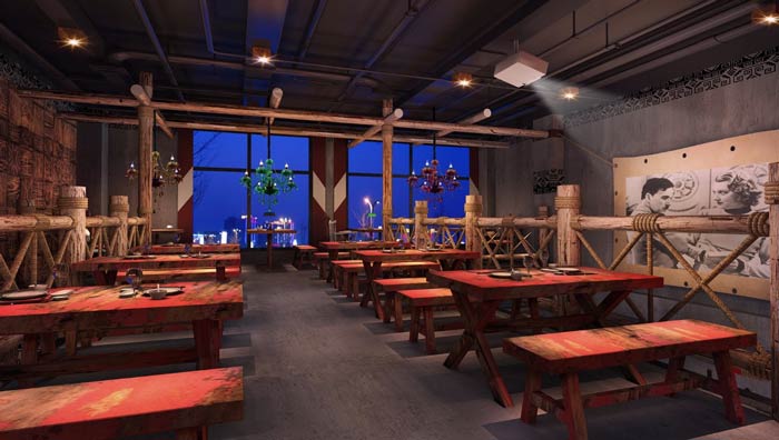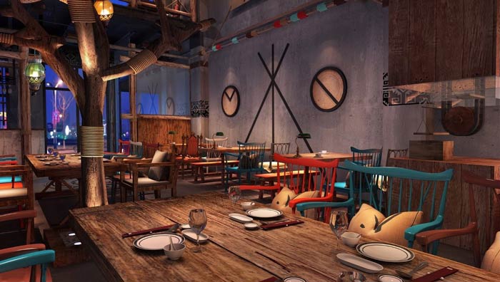 燒烤店一樓餐區(qū)設(shè)計(jì):此處給人的第一感覺(jué)好似是一個(gè)原始部落,客戶在這里就餐會(huì)感受到不一樣的氛圍,安靜的空間氛圍,仿佛時(shí)間都慢了下來(lái),讓客戶靜靜的享受美食。