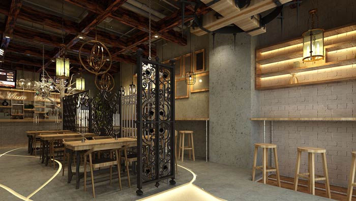 特色快餐店過(guò)道裝修設(shè)計(jì):過(guò)道從前臺(tái)之后,開(kāi)始一分為二,這樣做是希望讓餐區(qū)更加的便捷,整個(gè)空間四通八達(dá),使的餐廳效率提升,地面白色裝飾為整個(gè)空間帶來(lái)了活力。