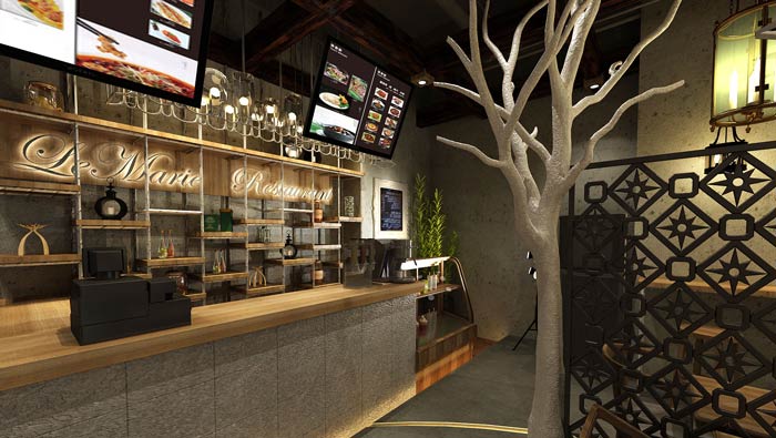特色快餐店前臺(tái)裝修設(shè)計(jì):既然是特色快餐廳,自然菜肴也是定制化的,不同的就是這里的上菜速度十分迅速,業(yè)主在速度、美味之間取得平衡,以此滿足客戶的需求。