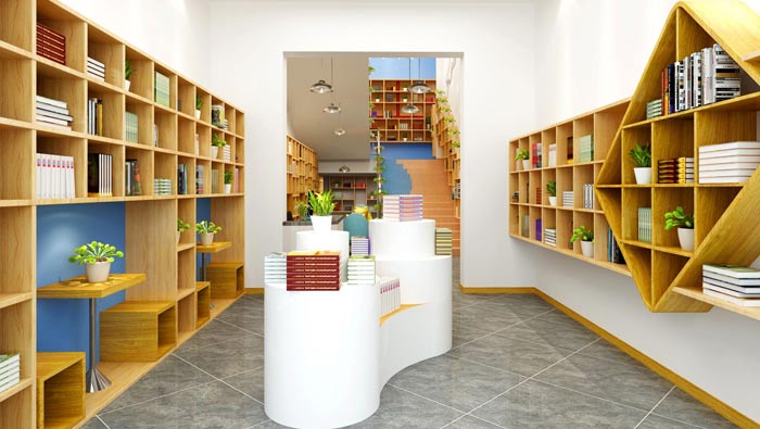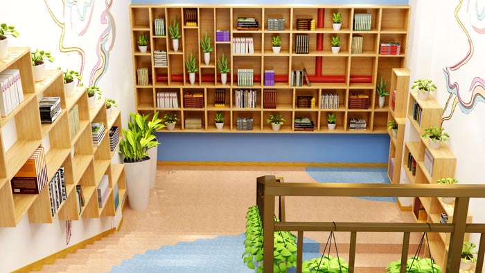 舞蹈培訓機構(gòu)一樓前廳設(shè)計:一樓前廳主要是圖書銷售、購買與閱讀,在這里有著各式各樣的書籍,孩子們可以在這里閱讀,柜子的設(shè)計,打破傳統(tǒng)的中規(guī)中矩,柜子中藏著休息區(qū)域,讓空間更有體驗感。