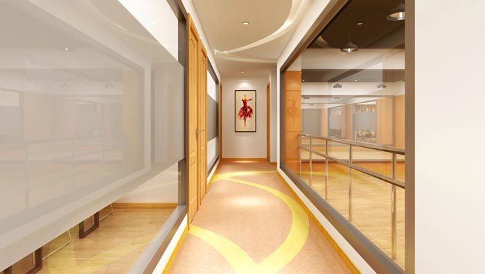 舞蹈培訓機構(gòu)二樓過道設(shè)計:二樓主要以舞蹈培訓為主,過道地面地板膠和頂面造型設(shè)計相互呼應(yīng),這樣的設(shè)計既能保證空間的靈動,同時又能折射出一種孩童對未來的幻想。