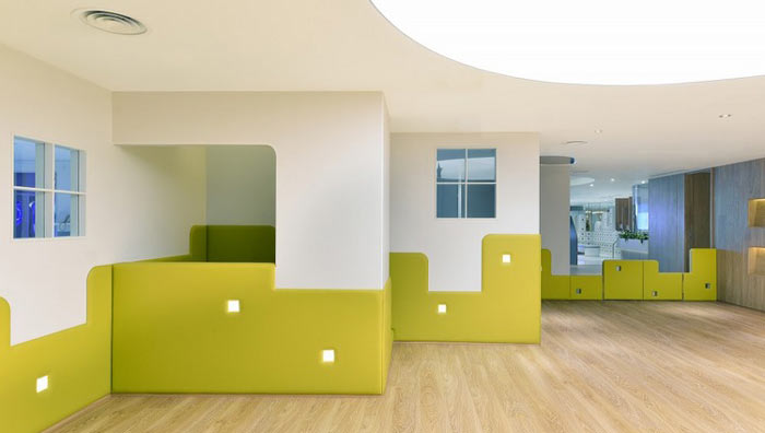 兒童教育培訓(xùn)機構(gòu)防磕碰設(shè)計:在孩子們可以夠得到的地方,設(shè)計師都加入了防磕碰海綿,目的就是希望給孩子一個安全、放松的空間,讓孩子們玩的開心、玩的放心。