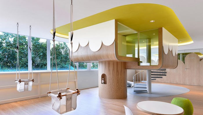 兒童教育培訓(xùn)機構(gòu)秋千區(qū)設(shè)計:探索樹上小木屋,讓孩子體驗像鳥一樣的自由自在,每天蕩秋千20分鐘,寶寶會快樂一整天,來源于戶外的靈感,營造舒適的室內(nèi)玩耍空間。