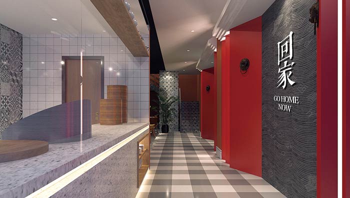私房菜餐廳進門過道設(shè)計:此處是客戶進入餐廳的必經(jīng)之道,回家兩個字預(yù)示著餐廳的服務(wù)宗旨,透明的廚房讓客戶,可以清楚的看到整個廚房的一舉一動,讓客戶吃的放心、安心。