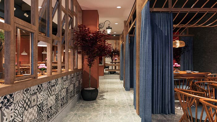 私房菜餐廳布藝窗簾設(shè)計:布藝窗簾做為空間的隔斷來使用,既可以起到阻隔的作用,同時也簡單、便捷,拉上形成一個獨立的就餐空間,拉開整個空間融為一體,即便捷又方便。