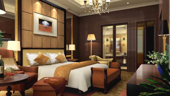 套房臥室的設計:人勞累之后最需要的就是休息,但是有時候會有躺下反而睡不著的現(xiàn)場,這個時候設計師的建議,不是逼迫自己入睡,而是起來叫一瓶紅酒、拉開窗簾,一遍喝著紅酒、一遍欣賞晚上的夜景,酒淺嘗輒止對人的入睡是有幫助的,欣賞夜景讓我們浮動的心平靜下來,隨著時間的流逝,倦意襲來,此時入睡是那么的自然。