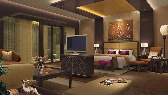 總統(tǒng)套房臥室的設計:靜怡是此處給人的感覺,在這里給人的感覺不僅是安靜,而更多的是文化的熏陶,床邊的躺椅讓他們躺在那里看書,閱讀書籍是一種享受,在設計師看來書籍是連接古代先賢的重要媒介,在這里顧客的心可以完全安靜下來,去體會心外無物的哲學問題。