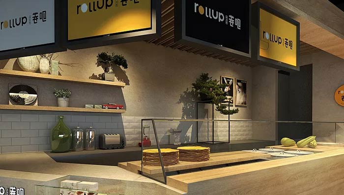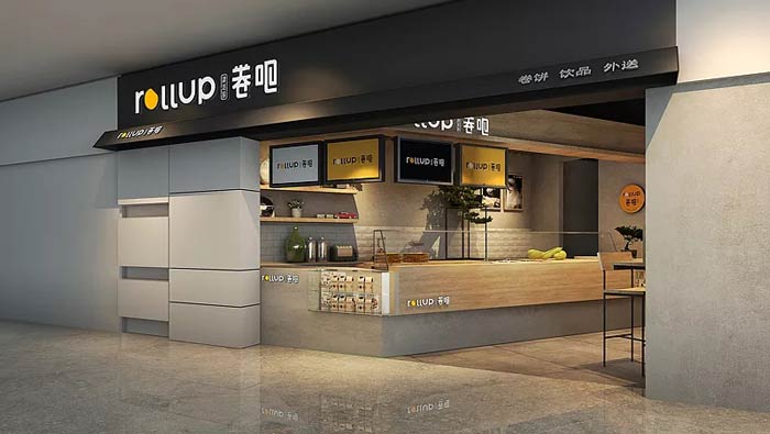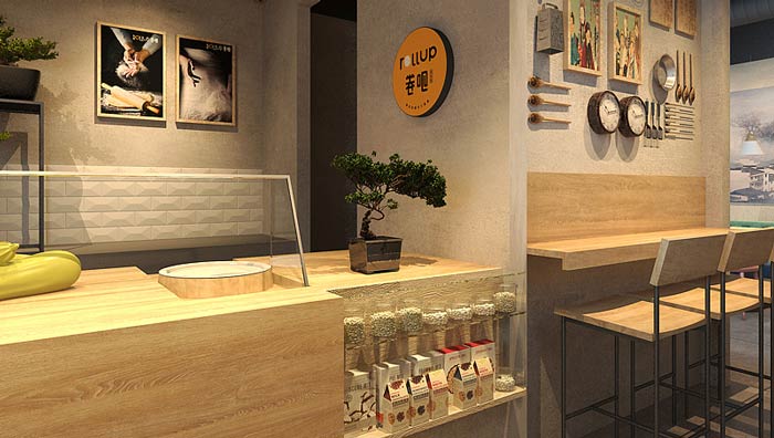 飲品小吃店柜臺裝修設計:進門直接看到的就是飲品和卷餅,這樣可以直觀的告訴客戶,這里有什么,設計師講究的是以事實說話,而不是以其他方式來展現(xiàn),這樣的設計簡潔、直觀。