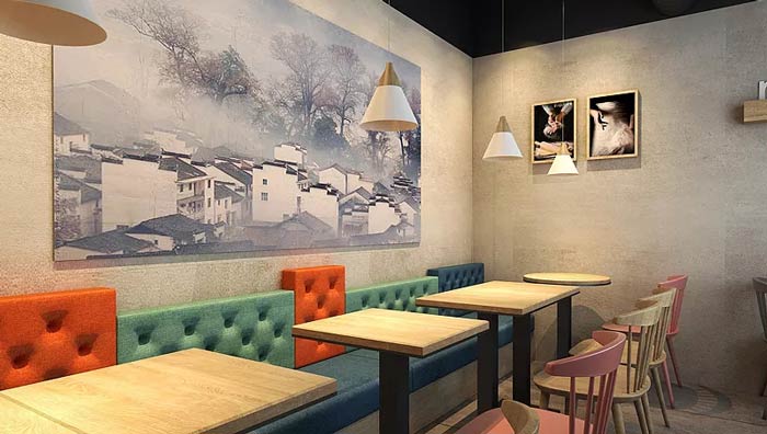 飲品小吃店餐區(qū)裝修設計:兩人區(qū)、四人區(qū)相互搭配在一起,兩人區(qū)位于內(nèi)部、四人區(qū)位于外部,客戶一邊吃著卷餅,一邊喝著飲品,背后鄉(xiāng)村的墻畫,讓我們仿佛回到了過去那個簡單的年代。
