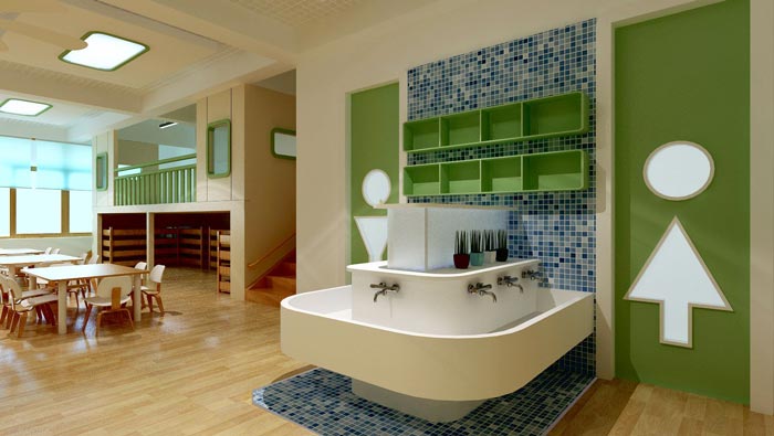 洗手區(qū)域的設(shè)計:此處通往的是就餐區(qū),在洗手池的設(shè)計上,設(shè)計師對地面、洗手池都做了處理,目的就是為了避免因?yàn)樗斐傻牡孛鏉窕?,兩個門一個進(jìn)一個出,設(shè)計是希望可以從小培養(yǎng)孩子排隊(duì)的意識,一進(jìn)一出之間也見證了教育的重要性。