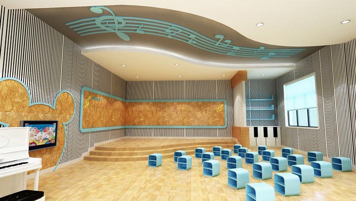 音樂教室的設(shè)計:這里大致可以容納下30多個小朋友,也就是大概一個班多一點(diǎn)點(diǎn),能歌善舞是每個家長對于孩子的特殊期望,對于孩子本身來說也是一個不可不得的技能,在設(shè)計師看來若是引導(dǎo)得當(dāng),讓孩子喜歡唱歌、跳舞也不失為一件功德無量的事情。