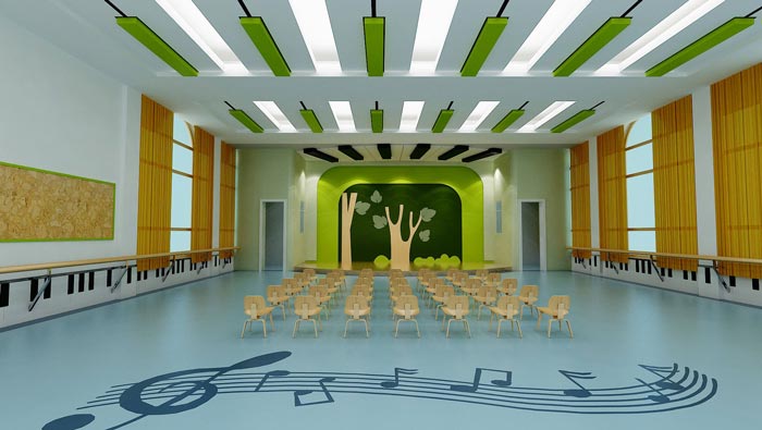表演區(qū)域的設(shè)計:這樣也就是最后一個音樂教室,但是這個教室與上兩個稍有不同,不同的就是屬性的改變,在此次設(shè)計師希望在滿足音樂教室的同時,也可以滿足表演的需求,設(shè)計師希望每一個孩子都是一個表演家,在臺上可以盡情的表演,培養(yǎng)每一個孩子表演、演講的能力。