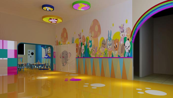 大廳的設(shè)計(jì):此處位于內(nèi)部空間的轉(zhuǎn)接口,這里最大的特點(diǎn)就是四通八達(dá),此處連接了空間的每一個(gè)區(qū)域,設(shè)計(jì)師要做的就是保證空間的暢通,地面動(dòng)畫(huà)的腳印、墻面動(dòng)畫(huà)中的各種形象、色彩的多樣化,無(wú)一不在吸引著孩子的注意力,設(shè)計(jì)師希望孩子在空間中是快樂(lè)的、開(kāi)心的。