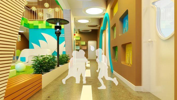 前臺的設(shè)計(jì):當(dāng)家長帶著孩子來到此地的時(shí)候,進(jìn)入空間第一眼看到的就是綠油油的自然景觀,這是設(shè)計(jì)師繼承了戶外的設(shè)計(jì)特色,自然地向內(nèi)延伸,讓人不會感到突兀,設(shè)計(jì)師的想法就是讓孩子進(jìn)門就看到一個(gè)五顏六色的世界,滿足孩子濃重的好奇心,讓孩子一眼就喜歡上這里。