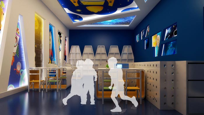 科幻教室的設(shè)計(jì):在這里可以引發(fā)孩子們的聯(lián)想,相信大家在小時(shí)候都喜歡幻想,在設(shè)計(jì)師看來聯(lián)想與幻想就是搭配得當(dāng),對于人的成長十分有好處,故此設(shè)計(jì)師采用高科技打造一個(gè)立體式的科幻空間,讓孩子在這樣的空間中好奇心得以滿足,并以此為起點(diǎn)引發(fā)孩子對未來探索的興趣。