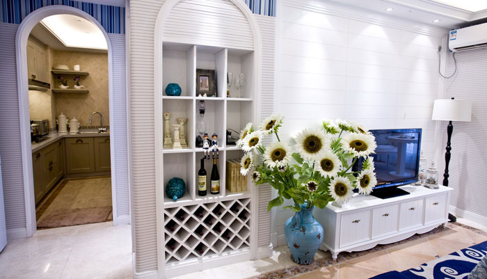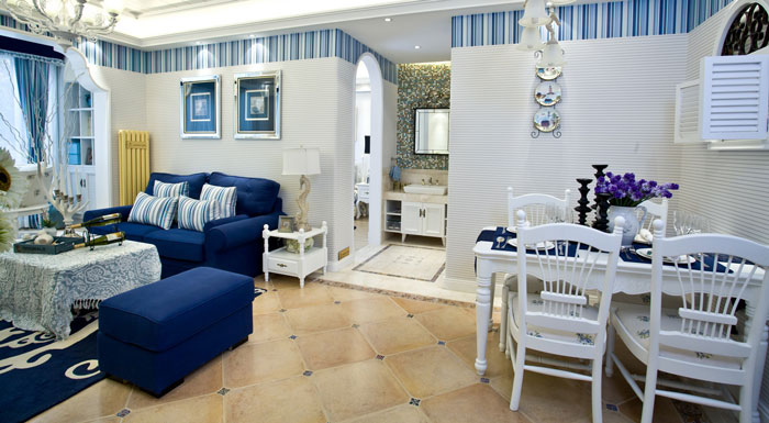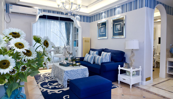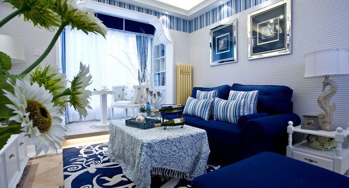多以藍白色調為主,空間布置中加入海洋類裝飾物件,如帆船貝殼之類,地中海風格客廳中條紋沙發(fā)占有主要點綴作用。