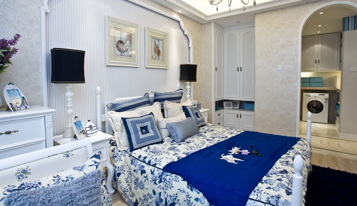 如馳騁在浩瀚的海洋一般,寬敞開闊;藍色的床品搭配白色的床架,條紋地板或地毯的結合,將地中海風格臥室打造的簡單舒適。