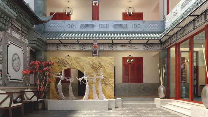 酒店進(jìn)門區(qū)域的設(shè)計(jì):此處在設(shè)計(jì)中融入了白族的文化內(nèi)涵,目的就是希望讓客戶感受到歷史的傳承,在現(xiàn)在人心浮躁的今天,設(shè)計(jì)師很希望讓大家可以靜下心來聆聽歷史,在歷史中尋找那難得的清靜,不管是瓦礫還是彈琴奏樂的場(chǎng)景,都讓人有種回到古時(shí)的感覺,讓人去體會(huì)那莊公夢(mèng)蝶的體會(huì)。