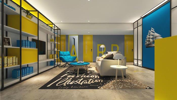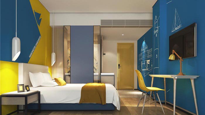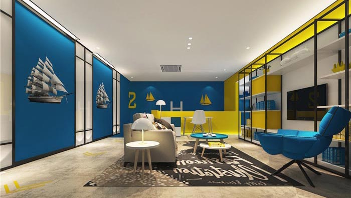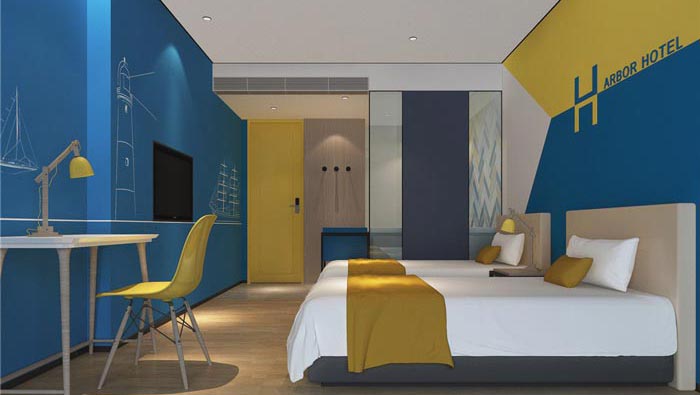 雙人間的設(shè)計:空間以藍黃兩色為主,就是希望打造一個簡約、時尚的住宿空間,仿木紋的地板、玻璃隔斷以及由花磚拼接而成的墻面裝飾,種種設(shè)計都是為了給客戶營造一種強烈的層次感和時尚感,其中藍色海洋與帆船,寓意著如家一般的溫馨港灣。