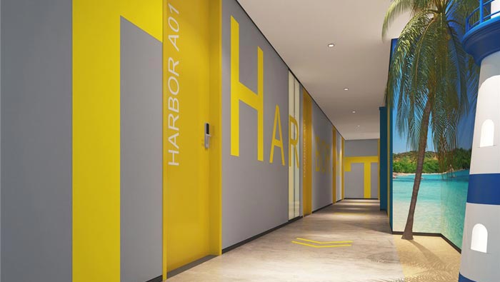 過道的設(shè)計:引導(dǎo)線加上燈塔為我們指引了方向,讓我們更加具象的了解燈塔的作用,同時風景宜人的墻畫讓我們仿佛置身于海島之中,讓客戶在此處可以感受到海洋的魅力,讓大家對于海洋有更多的憧憬,客戶所需正是酒店所求,這也是此次設(shè)計的目標,讓更多的人了解自己、認識自己,以此去尋找那屬于自己的心靈港灣。