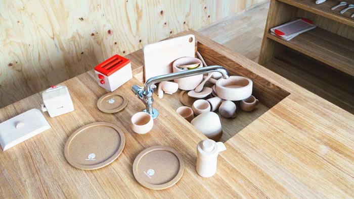 洗手池的設計:通過這里可以看出設計師對于孩子安全的關心,木質(zhì)材料做成的桌子、餐具、勺子,保證了孩子的安全,同時十分衛(wèi)生,讓孩子們在這樣可以快樂、健康的成長,讓孩子在不斷在實踐中成長自身,從小培養(yǎng)孩子實踐的習慣,這會讓孩子一生都受益終生。